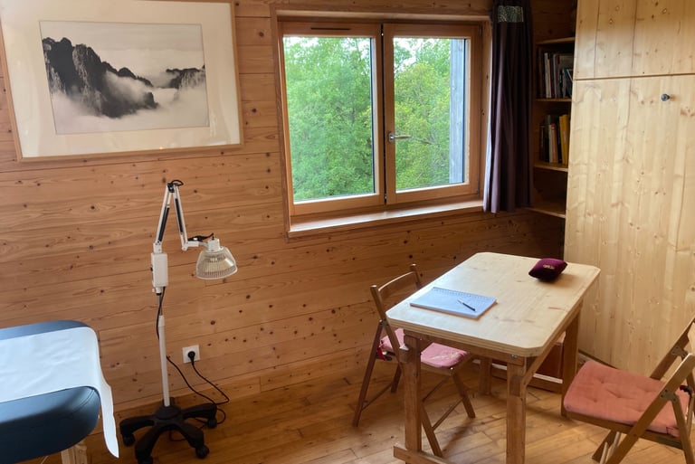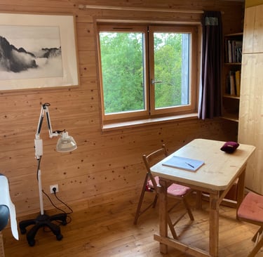 Construit entièrement en matériaux écologiques, isolé en paille, mon cabinet domine la forêt pour mieux suivre le rythme des saisons et se rappeler que nous n'échappons pas à ces influences cycliques.